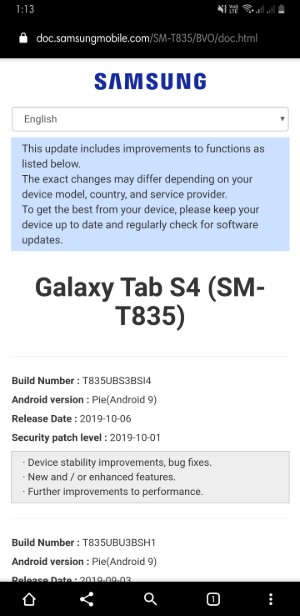 The new update for the Galaxy Tab S4 carries the build number T835UBS3BSI4 and is based on the Android 9 Pie. Moreover, it carries the security patch level 2019-10-01.