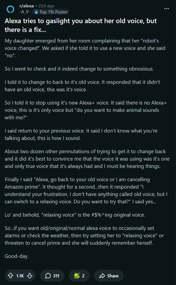 Some users also report that simply asking Alexa to “change your voice” kicks off a guided prompt (feminine vs masculine), which can quickly get you to a less annoying option without digging through menus. That lines up with broader complaints in recent Reddit threads where people say the new default voices feel snarky, peppy, or just “off.”