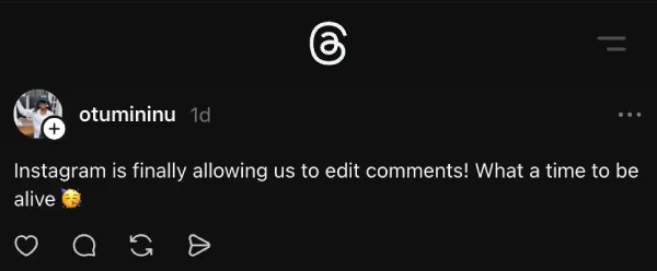 Users are seeing an “Edit” option appear directly below their comments alongside the existing ‘Reply’ and ‘Share on Threads’ buttons. Once a comment is edited, it shows an “Edited” label, so other users can tell it was changed after posting.