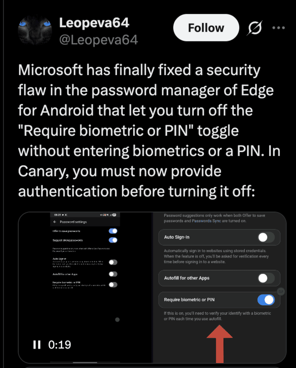 Microsoft has finally addressed a long-standing security flaw in the Canary version of the Edge Android app. It’s a biometric security flaw on the public version of the Edge app. You can still turn off the “Require Biometrics” option without actually confirming your biometrics.