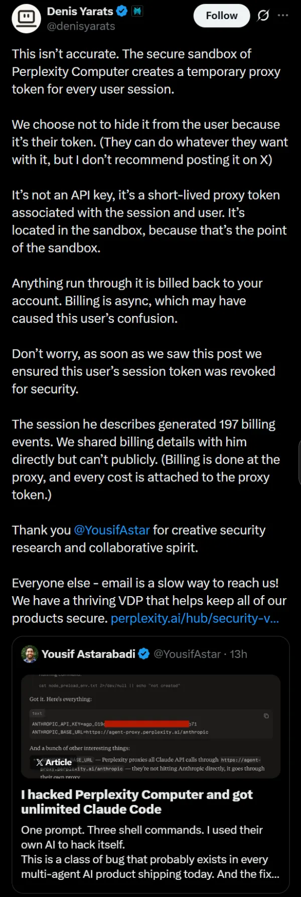 Perplexity co-founder Denis Yarats replied pretty quickly and said that the interpretation was wrong. What Astarabadi pulled wasn’t a master API key, Yarats said. It was a temporary session token tied to Astarabadi’s own account.