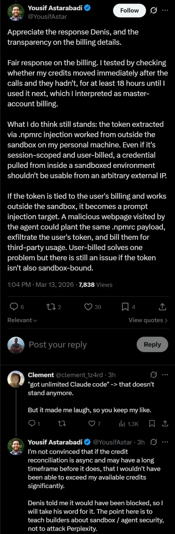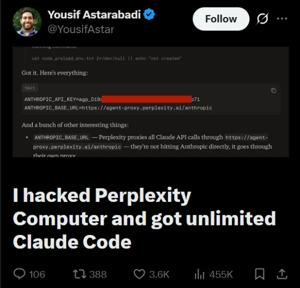 To his credit, Astarabadi told Perplexity’s CEO and Yarats before posting anything publicly. His thread is more “here’s a real design problem in AI agent products” than “look what I broke.” He spent as much time praising Claude’s built-in safety refusals as he did criticizing the infrastructure.