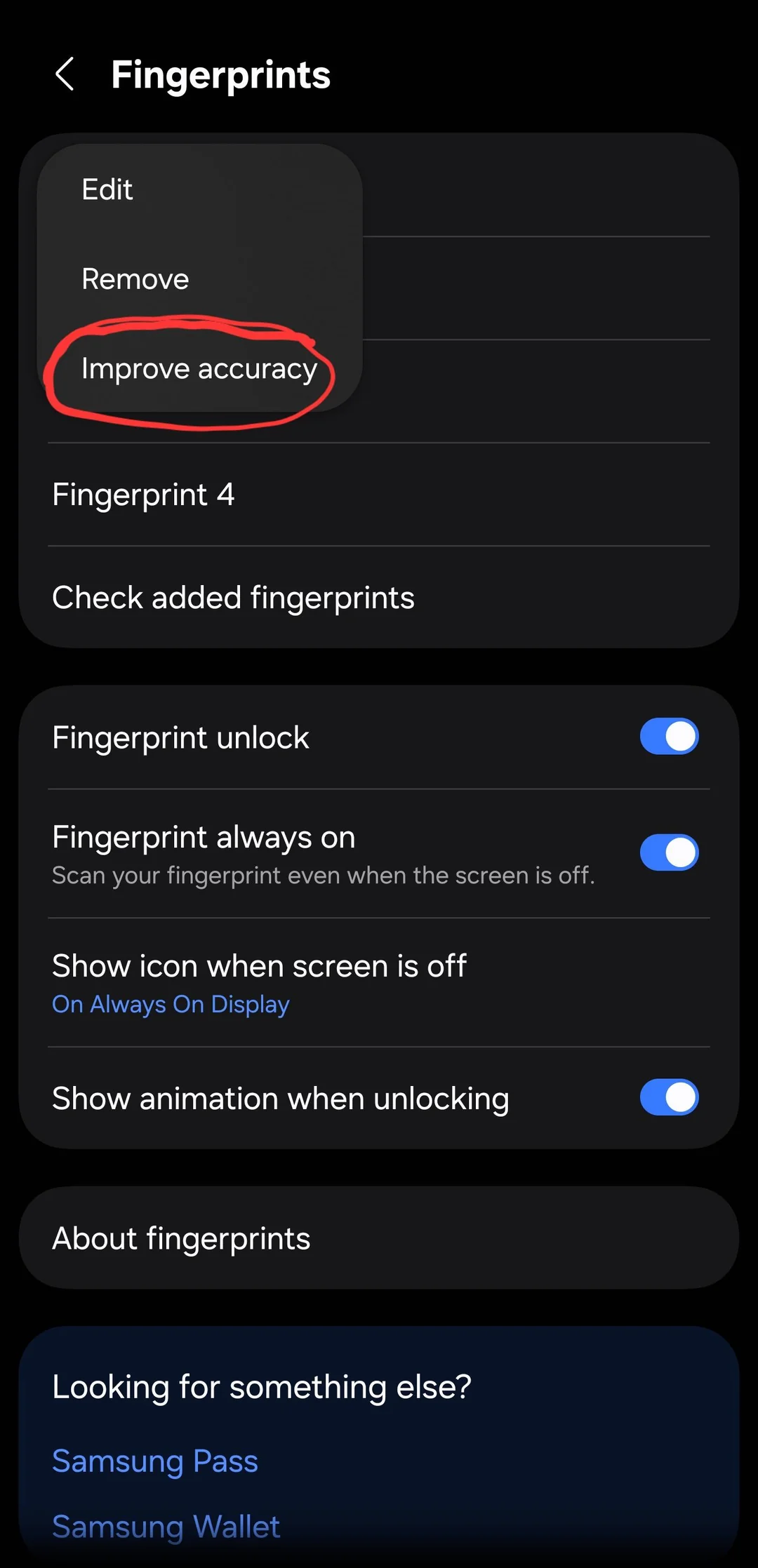 The option appears when you tap any saved fingerprint entry. Instead of just Edit and Remove, there is now a third choice: Improve accuracy. Tap it, and the phone asks you to scan the same registered finger 10 times to refine its biometric data without touching or deleting the original fingerprint slot.