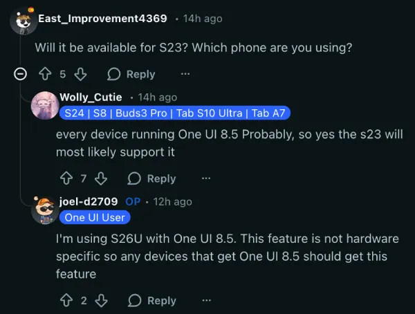 Several users in the same Reddit thread say they are on One UI 8.5 beta on the S25 and do not see the option. The OP says they are on the S26 Ultra and believes the feature will show up in later beta builds or the stable release for other eligible devices, since it is purely software-based.