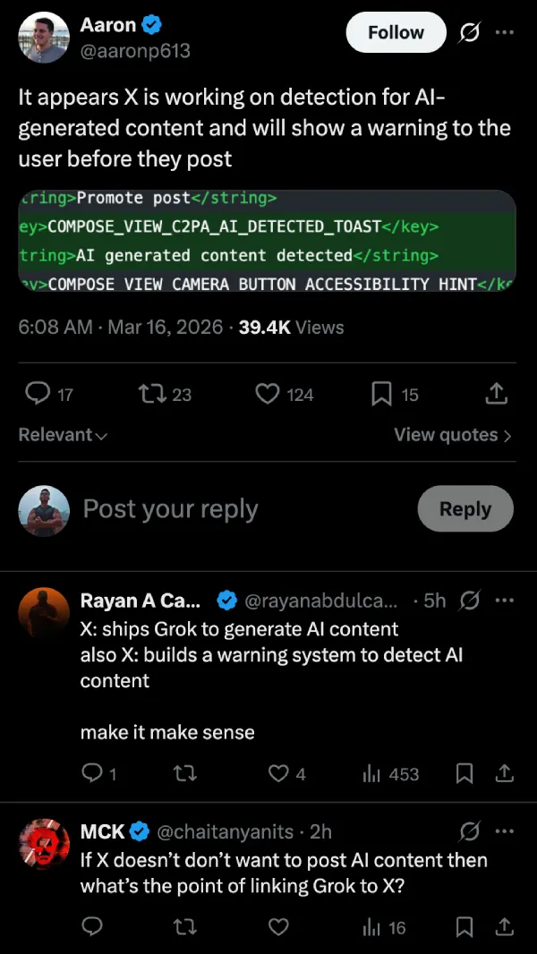 It seems like X is developing some kind of automatic detection for AI-generated content, and it could show a prompt right when you try to post something it flags. A leaker found strings in the app that suggest a notification on the compose screen saying “AI generated content detected,” popping up before the post actually goes out.
